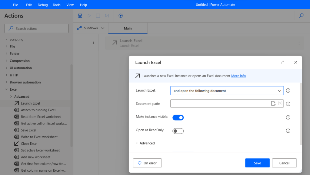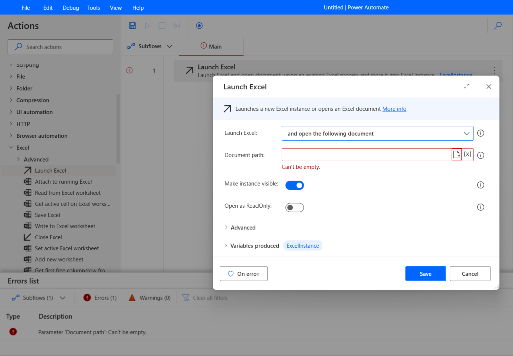 แต่ถ้าเราสั่งให้โรบอทเปิดไฟล์ Excel ตาม path ที่เราบอก (Launch Excel and open the following document) ก็จะมีให้เราใส่ว่า Document path คือที่ไหน