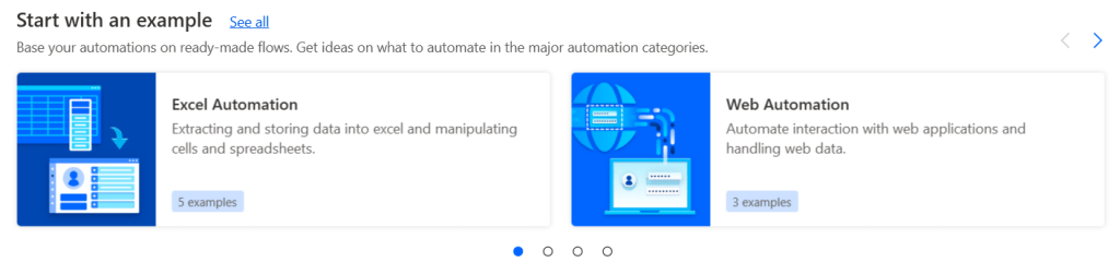 เลื่อนลงมาจะมี Start with Example (เหมือนกับที่ Examples tab) ให้เราเข้าไปดูตัวอย่างที่ไมโครซอฟท์เขียนโฟลว์เรื่องต่างๆ ไว้ เช่น Excel Automation, Web Automation