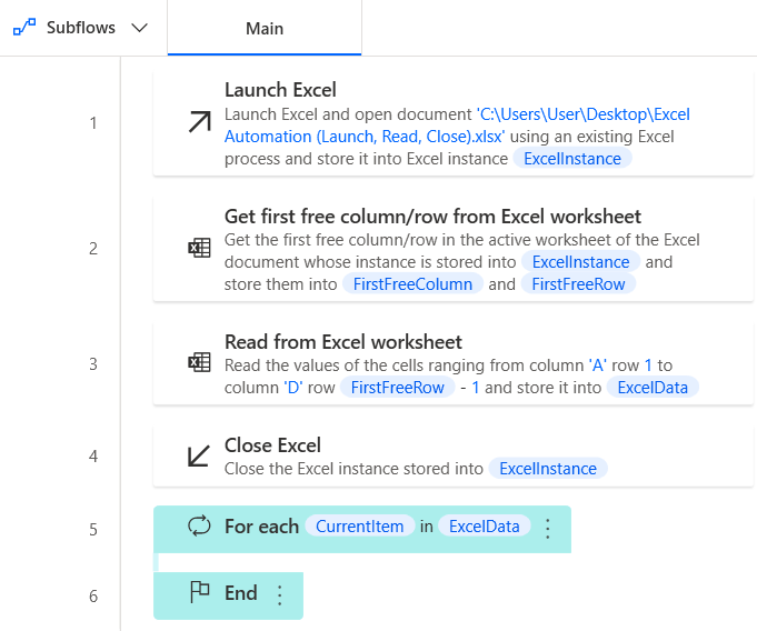 Drag “For each” to the workspace next to “Read from Excel worksheet” action.