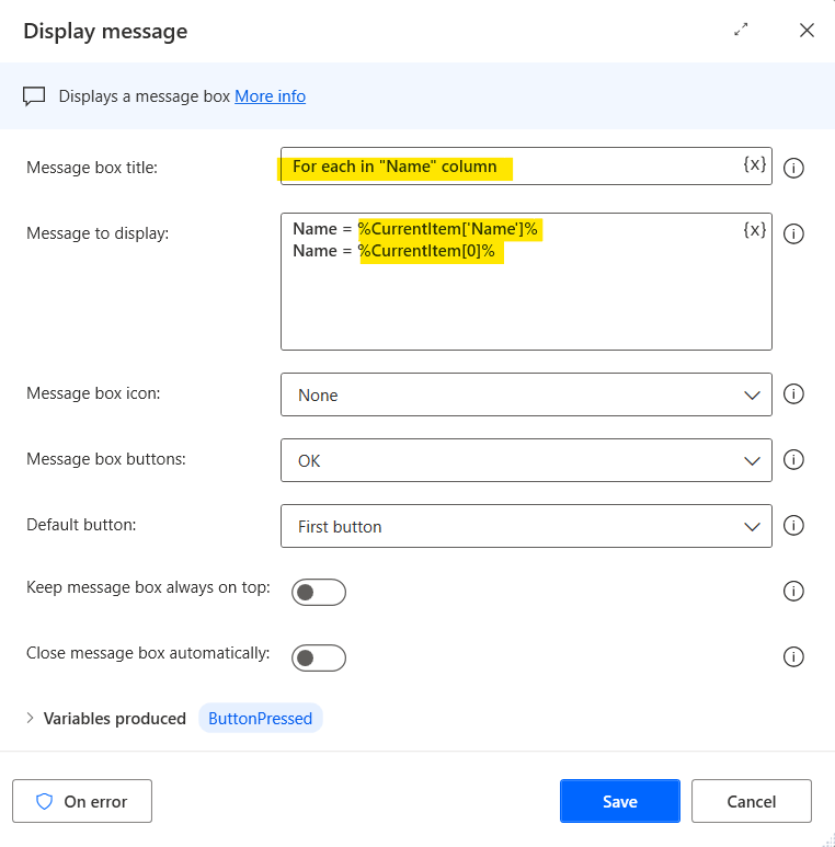 In this article, I want to extract the value in Column “Name” which is the first column (Column index = 0), so I can enter the variable as %CurrentItem[‘Name’]% or %CurrentItem[0]% as well.
