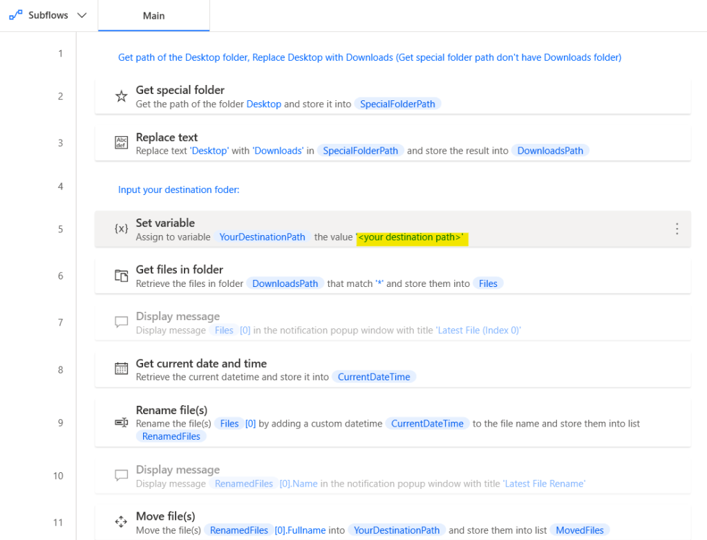 At the 2nd line action, Display message, the message box will show C:\Users\User\Downloads\TestRename.txt