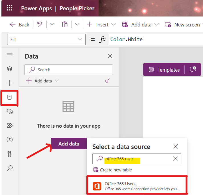 ไปที่ tab “Data” กดปุ่ม “Add Data” แล้วค้นหา connector “Office 365 Users”