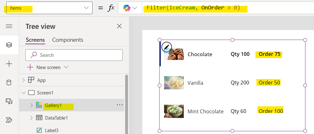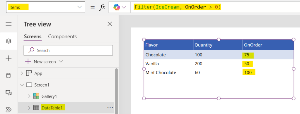 Filter(IceCream, drpFlavor.SelectedText.Flavor = Flavor)