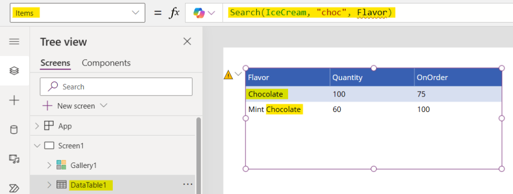 Filter(IceCream, "chocolate" in Lower(Flavor ))
