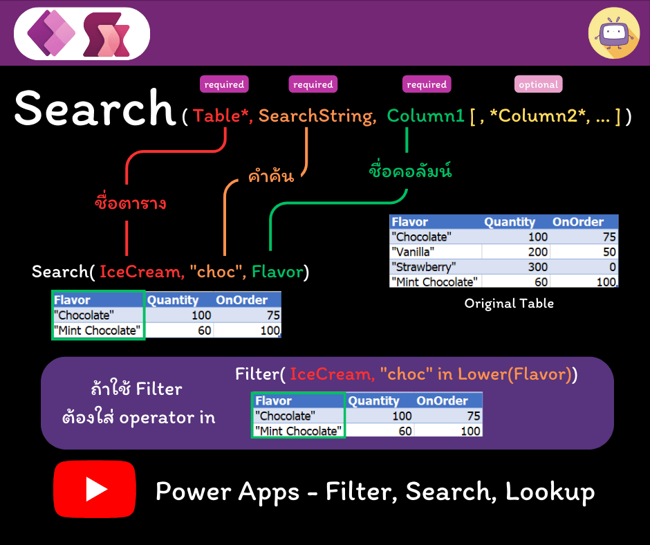 Search คือ ฟังก์ชันที่ใช้ค้นหา record ในตาราง ที่มีข้อความ (string) ตรงกับคอลัมน์ โดยที่ข้อความนั้นจะอยู่ส่วนไหนในคอลัมน์ก็ได้ เช่น ให้หาคำว่า “choc” ฟังก์ชัน Search เป็น case-insensitive