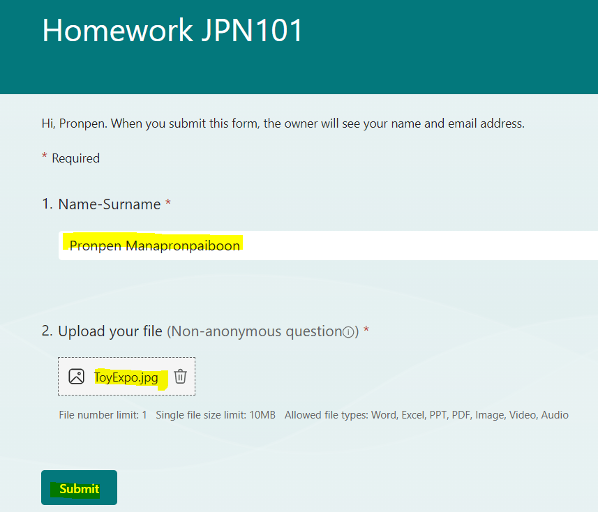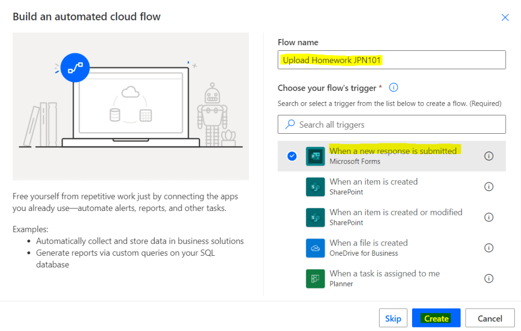 Name the flow, for example, “Upload Homework JPN101”, select trigger “When a new response is submitted”, and press “Create” button