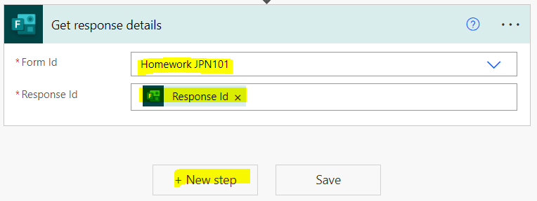 Select “Get response details” action, select Form Id, add dynamic content Response Id and press “New Step”