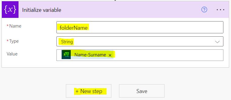 Select “Initialize variable” action, name the variable, select variable type, add dynamic content as per below image and press “New Step”