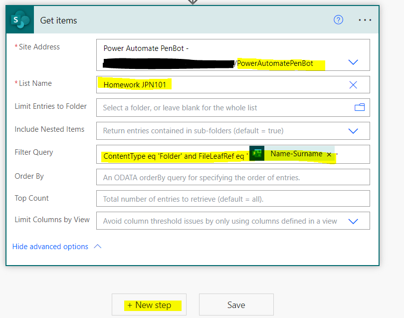 - Select your folder and type / and select dynamic content “folderName” from “Initialize Variable” step