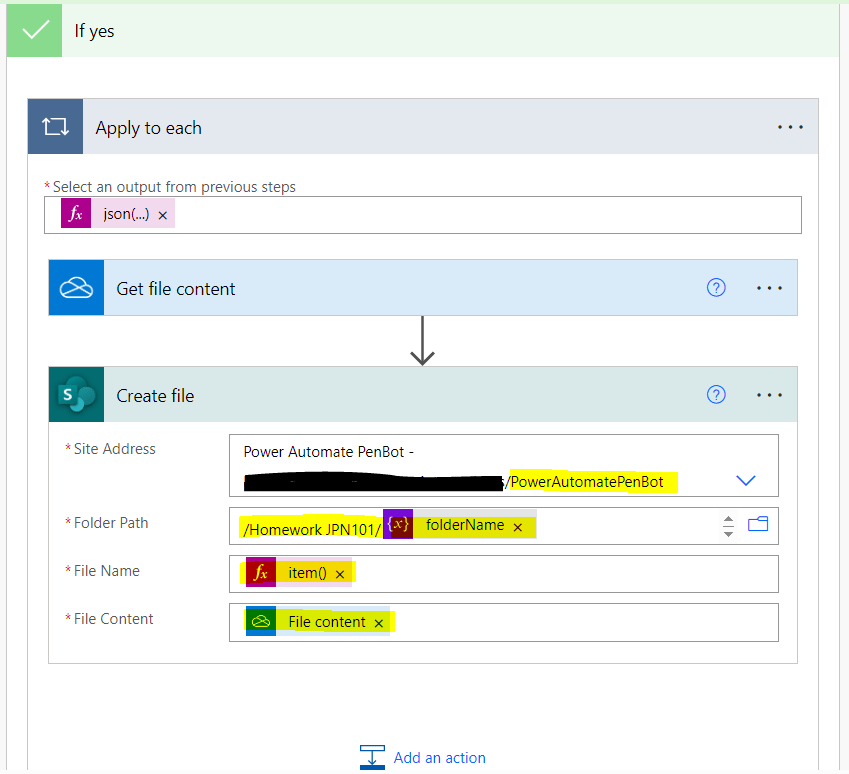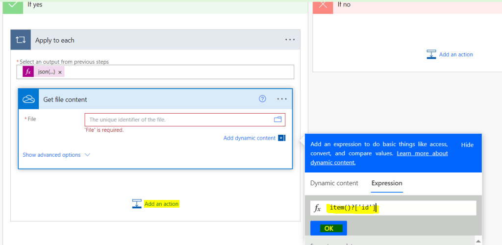 Add “Get file content (OneDrive)” and type expression as per below code block, press “OK” button, and press “Add an action” in apply to each