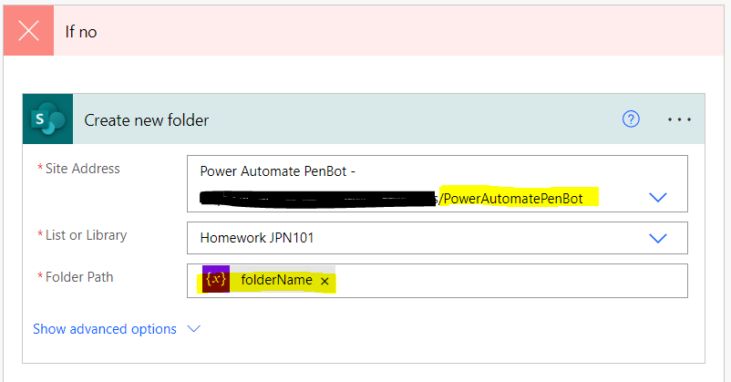 - Add dynamic content “folderName” from “Initialize Variable” step