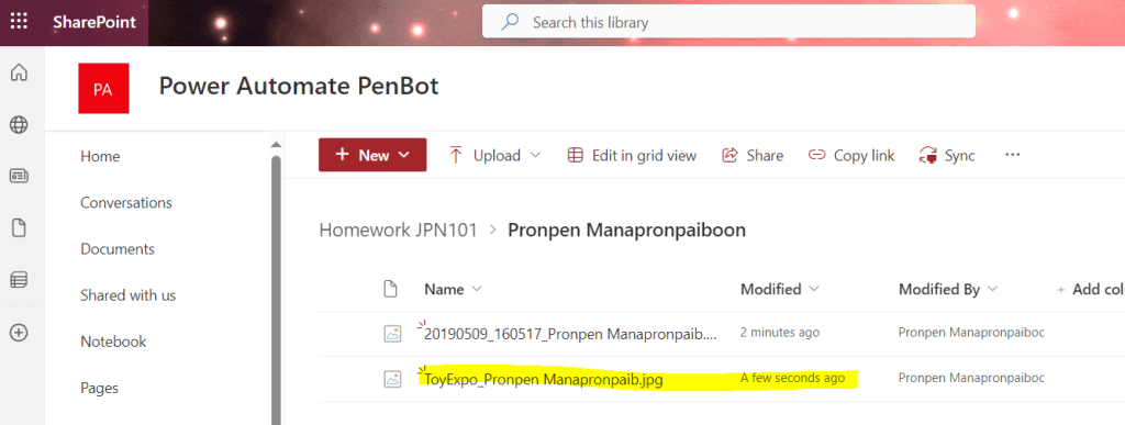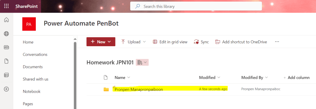 In my case, I will use the existing SharePoint site named ‘Power Automate PenBot’. Press ‘New’ and select ‘Document library’.