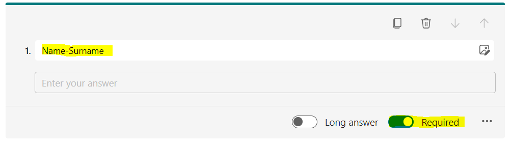 3. Type ‘Name-Surname’ in the question field, then toggle on the ‘Required’ option as shown in the image below