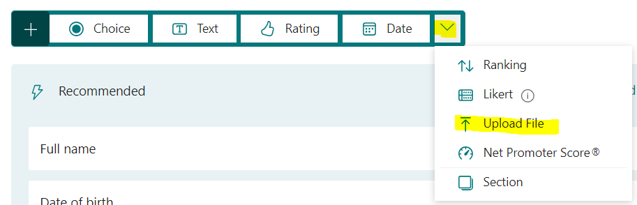 5. Type ‘Upload your file’ in the question field, then select file number limit as 1 and toggle on the ‘Required’ option as shown in the image below