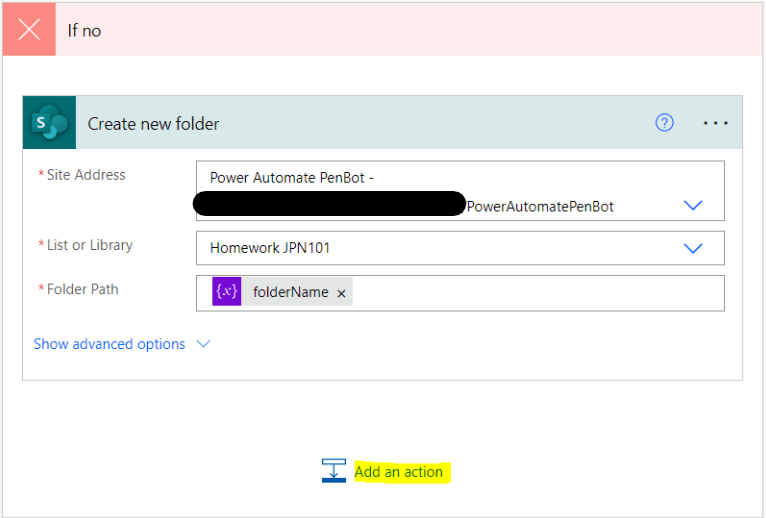 10. กด Add action ที่ฝั่ง “If no” (ไม่มีโฟลเดอร์ชื่อนักเรียนคนนั้นอยู่ใน SharePoint library)