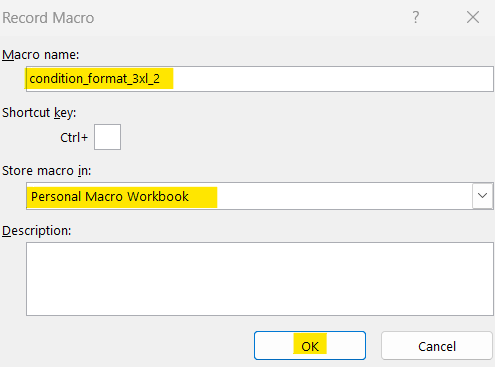 ลองกด Record Macro แล้ว ทำขั้นตอนที่ 7 คือ เลือกช่วงข้อมูล (Ctrl+a) ใส่ conditional formatting