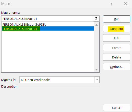 เลือกชื่อ Macros ที่เพิ่ง record ไป แล้วกด “Step Into”