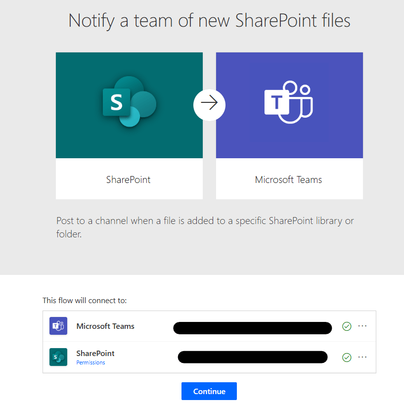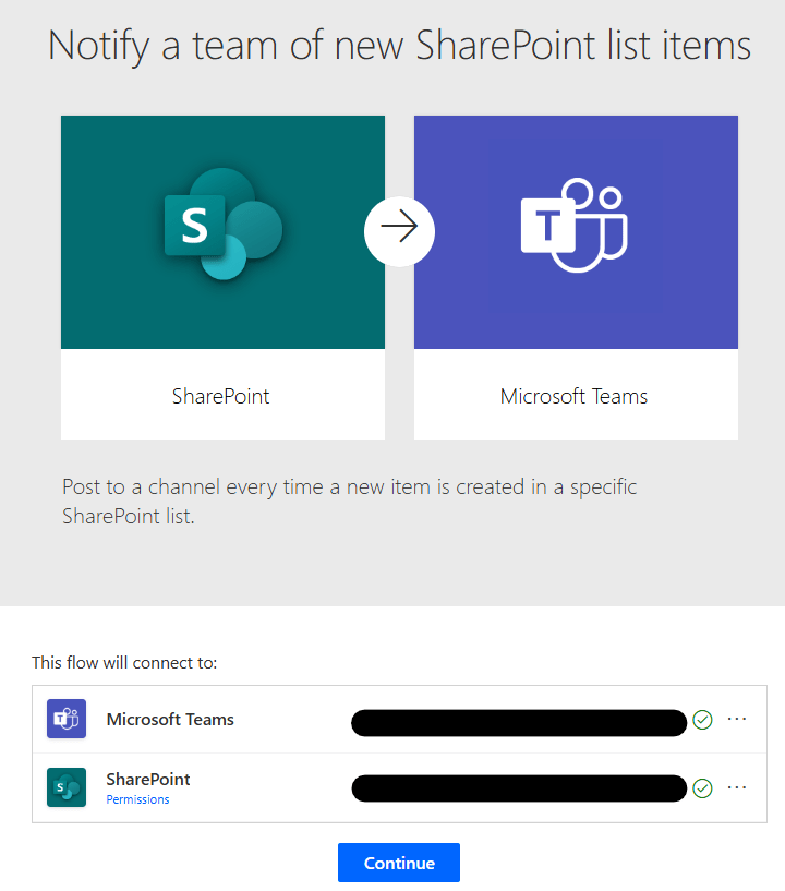 เลือก SharePoint site, SharePoint list, Microsoft teams team และ channel ที่ต้องการจากนั้นกด ‘Continue’