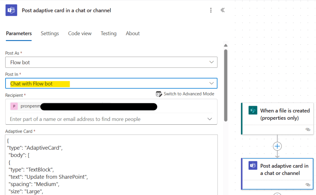 ถ้าหากต้องการให้ Power Automate แจ้งเตือนแค่เรา สามารถเปลี่ยน parameter ‘Post in’ เป็น ‘Chat with Flow bot’ แล้วเพิ่มตัวเองเป็น recipient ได้เลย จากนั้นก็ลบ Team ID และ Channel ID