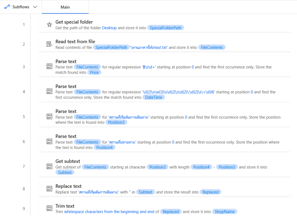 - Search for specific word “สถานที่เริ่มต้นการเดินทาง:” in “FileContents” and stores the position in “position1”