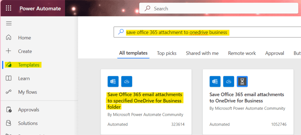 ไปที่ Power Automate คลิก Template แล้วค้นหา ‘save office 365 attachment to onedrive business’ จากนั้นคลิกที่ template ‘Save Office 365 email attachments to specified OneDrive for Business folder’