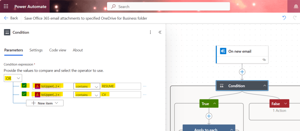 แก้ไข condition ต่างๆ ตามความต้องการของคุณ สำหรับบทความนี้ เราจะสนใจ ‘Subject mail’ ที่มีคำว่า ‘RESUME’ หรือ ‘CV’ ดังนั้นเราจะเขียน expression ทางด้านซ้ายมือตามรูปภาพและ code block ด้านล่าง