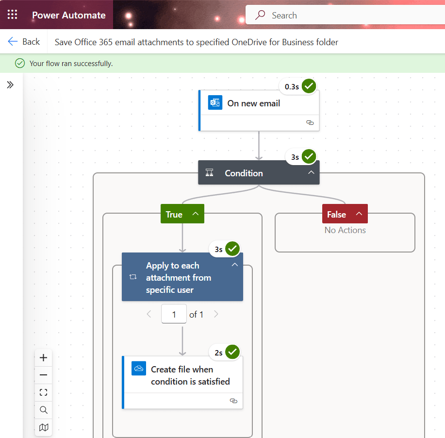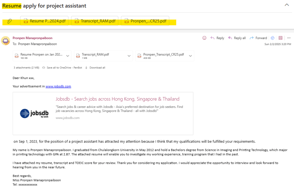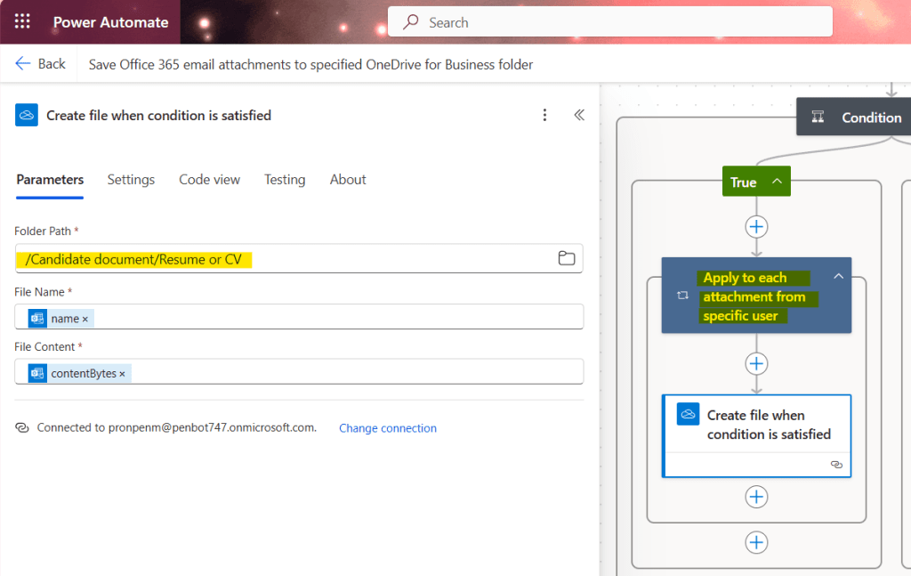กด Run flow แล้วลองส่ง mail ที่มีไฟล์แนบ โดยตั้ง subject mail ให้มีคำว่า resume หรือ cv เพื่อให้เข้าเงื่อนไข true condition