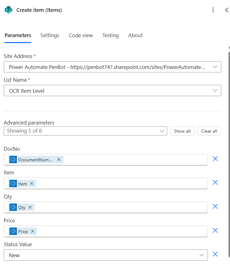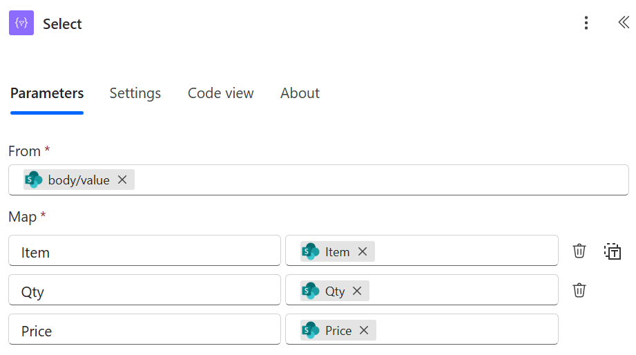 Map SharePoint column with dynamic content from ‘Run a prompt’ action e.g. DocNo, Item, Qty, Price