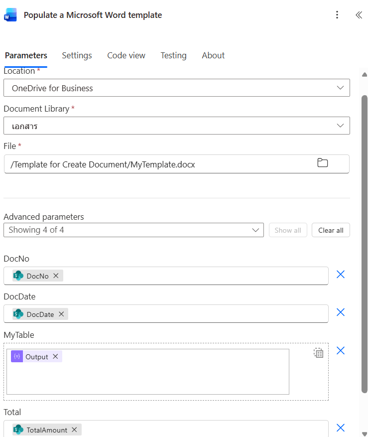 - Output from Template Document (Store MS Word Output after Power Automate run)