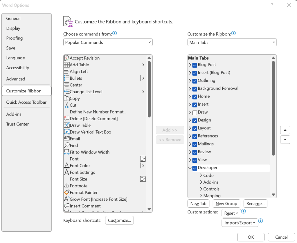 Open MS Word Desktop > Go to File > More > Options > Customize Ribbon > Select check box “Developer” > Click “OK”