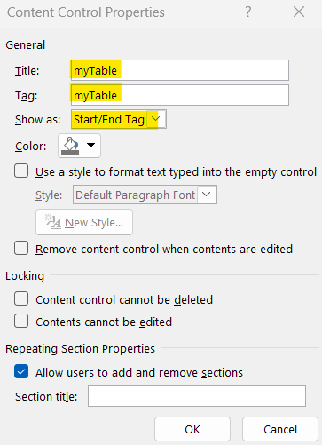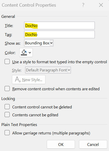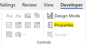- Select each content control and open Properties.