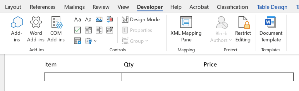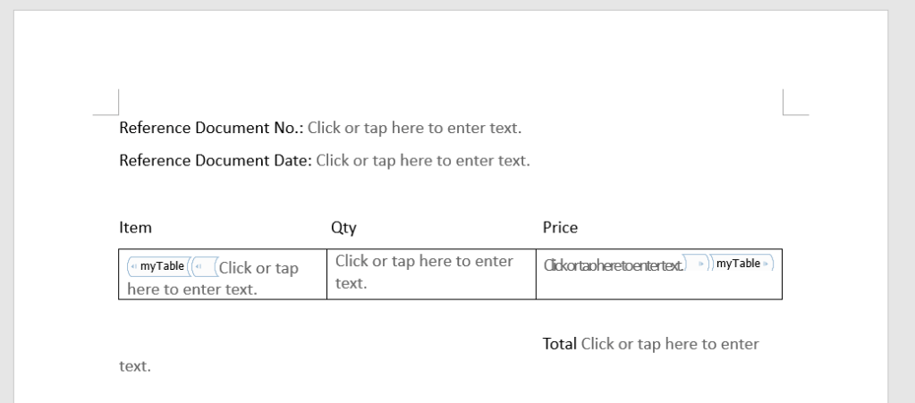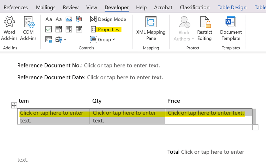 - Insert Plain Text Content Control to create dynamic fields for the following: Item, Qty and Price in each table cell