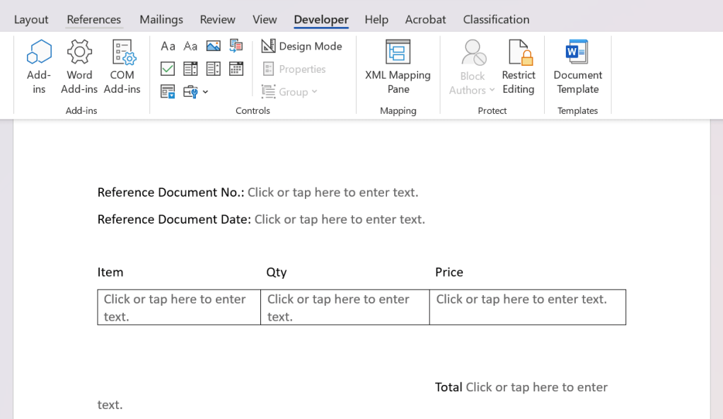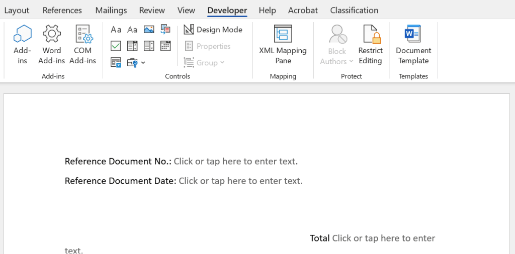 - Insert Plain Text Content Control to create dynamic fields for the following: Document Number, Document Date, Total